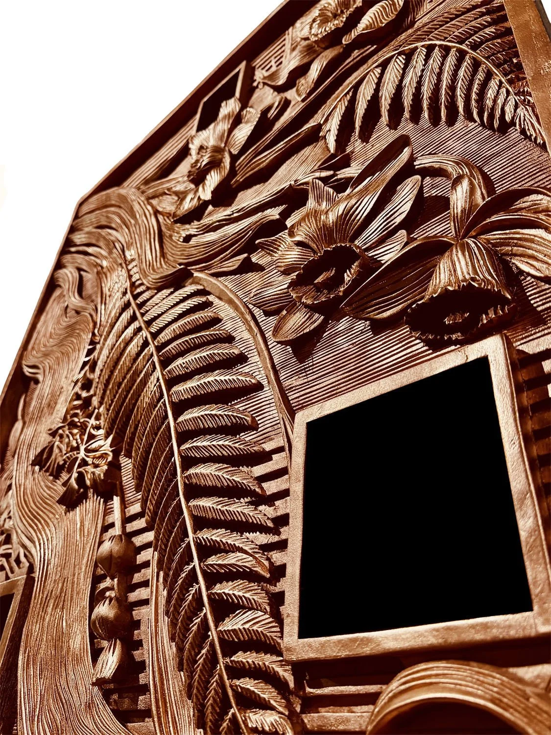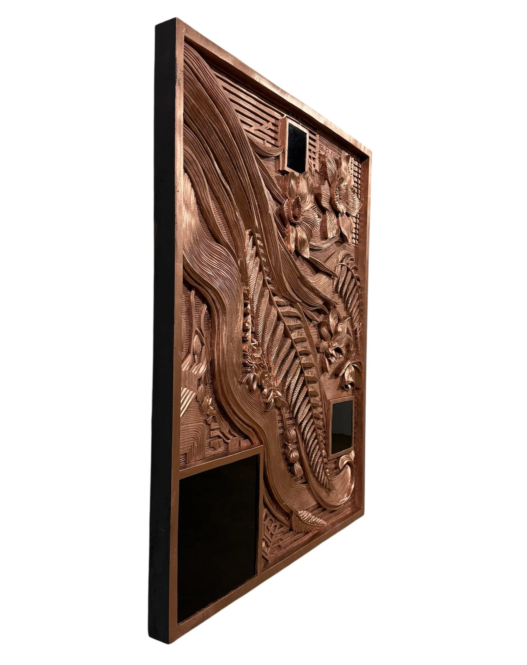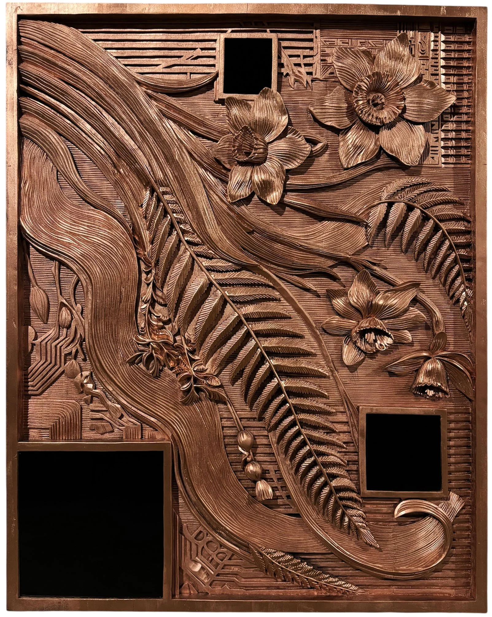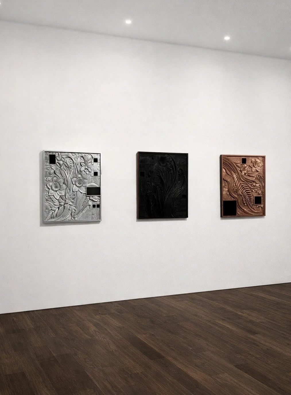 Alongside the burned black works, the series is also recreated in metal and copper tones, representing the two essential components of every digital device: conductive metals and circuitry. Their surfaces reveal the hidden interior of technology—what normally remains unseen.