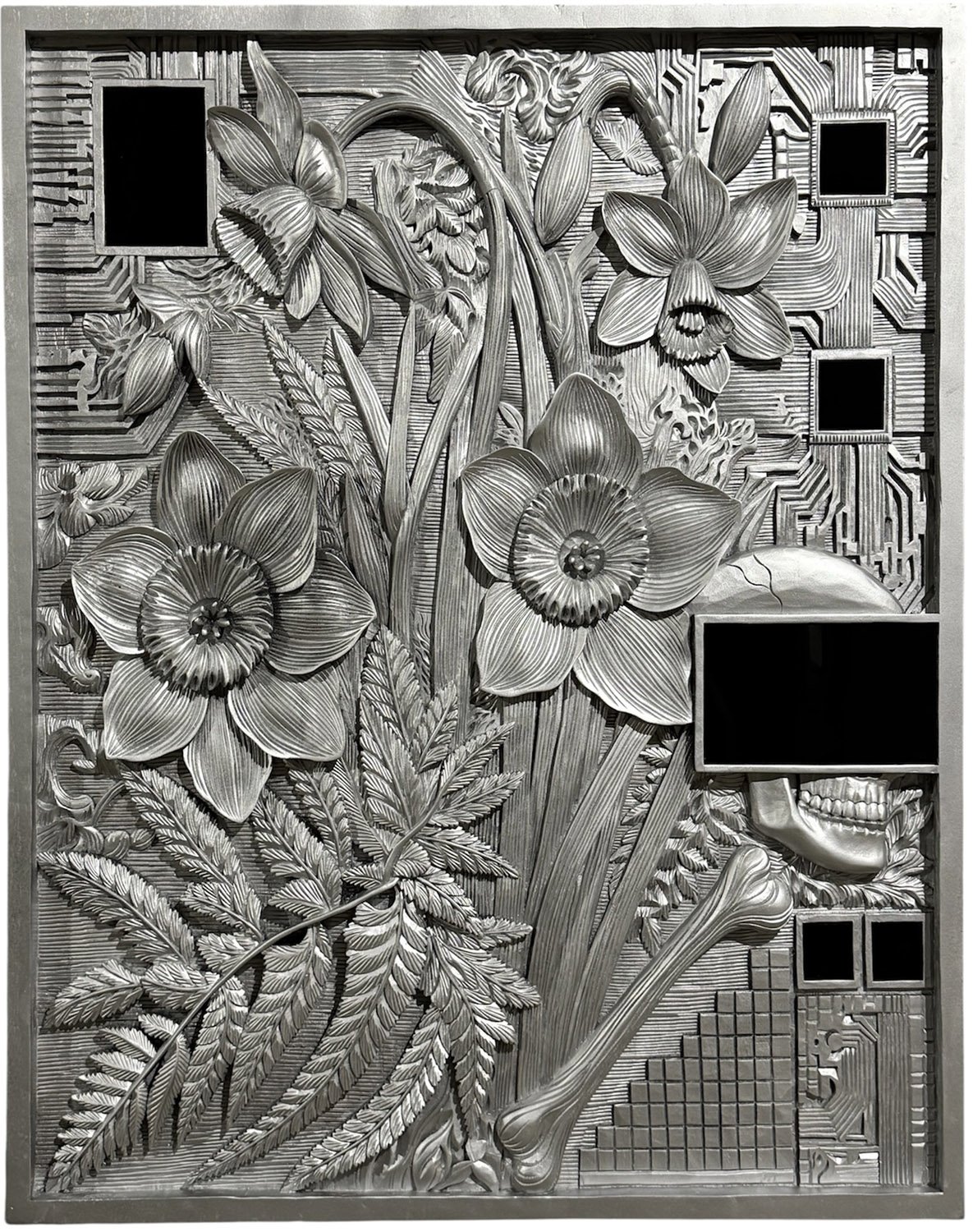 Narcissus flowers appear as symbols of human ego and vanitas, reflecting today’s self-focused society. Interwoven, circuit-like patterns extend this reflection into the digital realm, pointing toward a future shaped by technology and mirroring the systems that now define modern life. Black mirrors reference smartphones and omnipresent screens, symbolizing the digital revolution and humanity’s ongoing evolution.