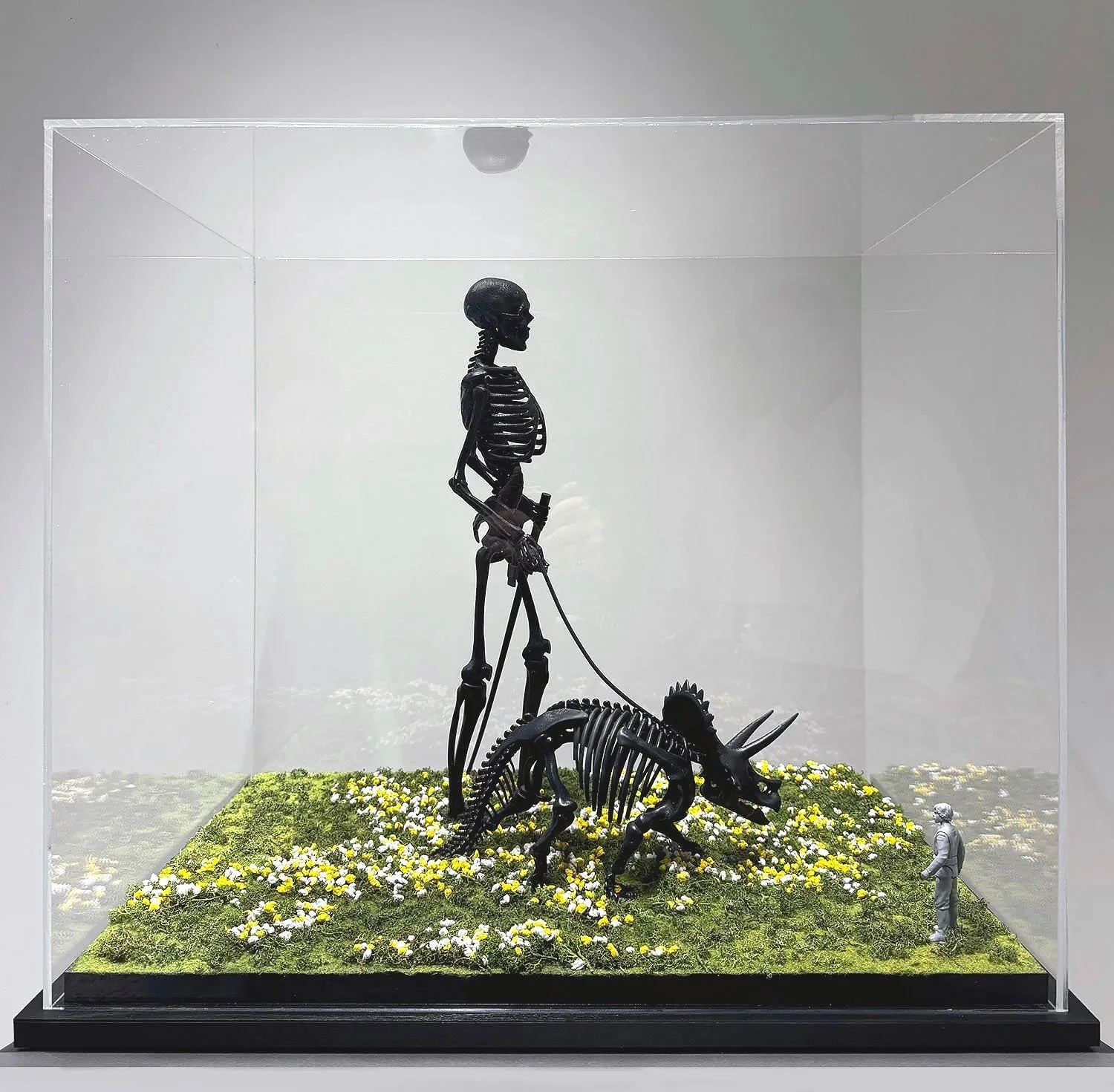 The artwork is presented inside a clear acrylic display case with a black wooden base.