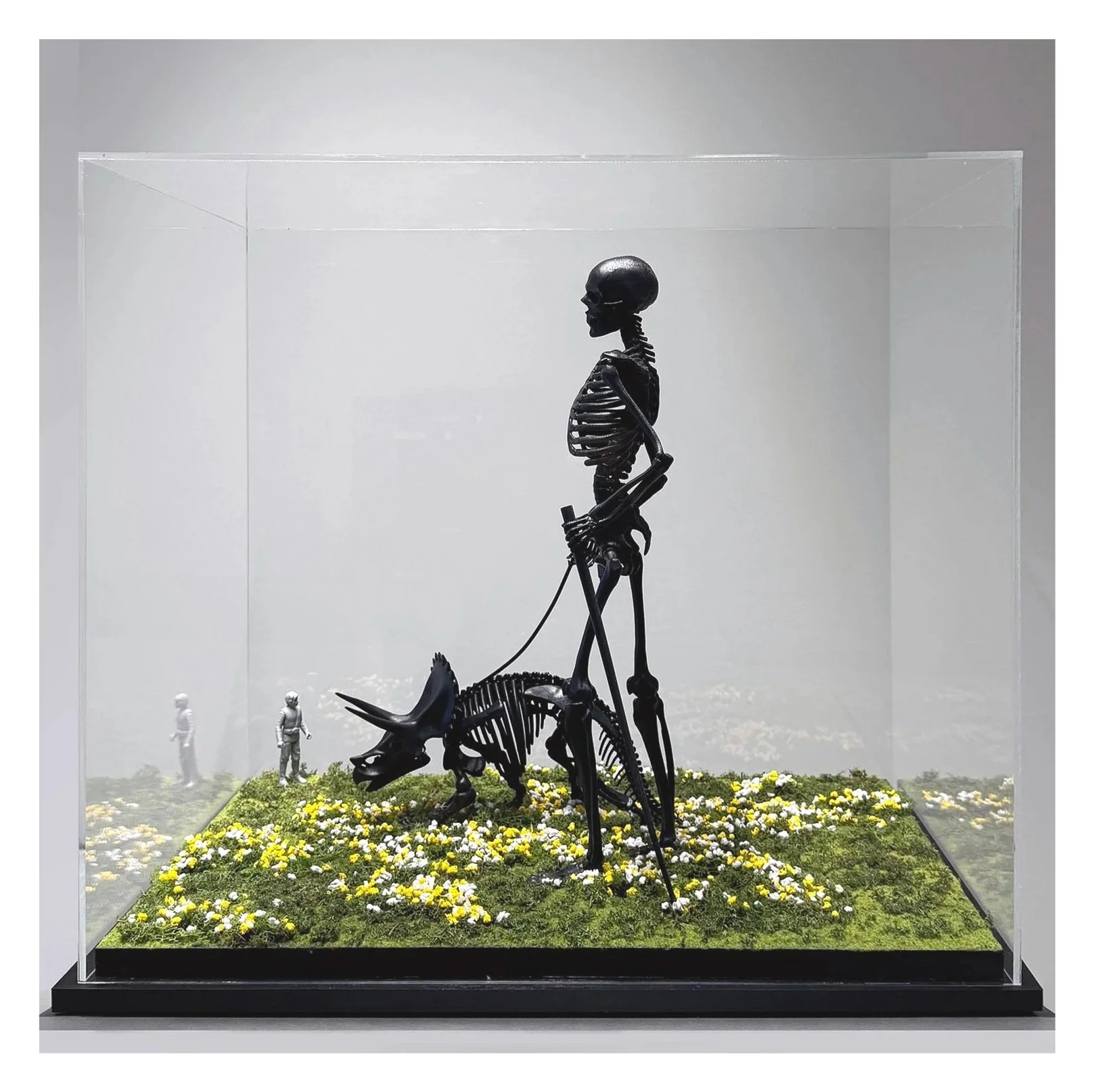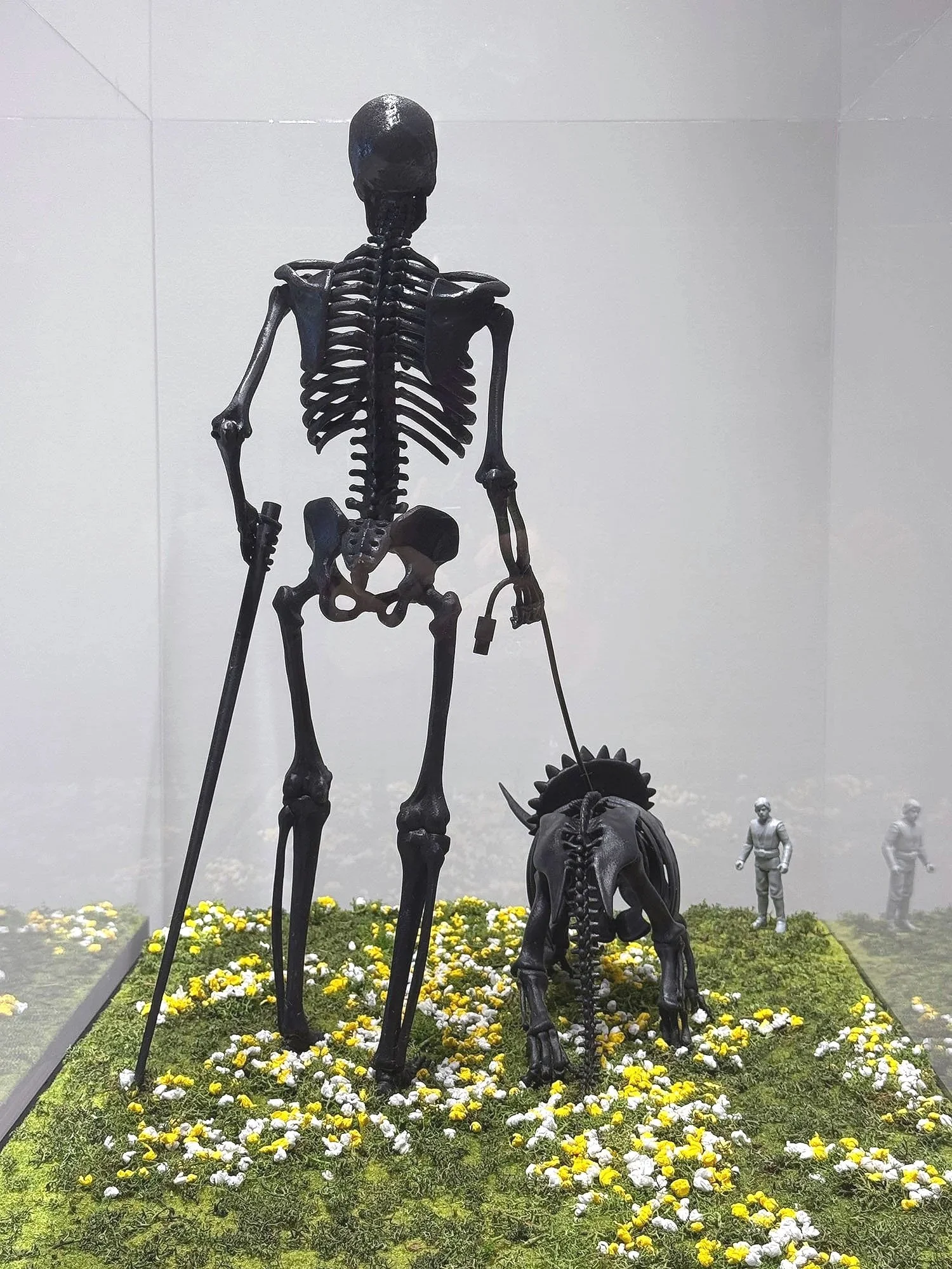 The scene features printed ABS skeleton figures arranged on a surface covered with artificial moss and miniature narcissus flowers, resembling a diorama.
