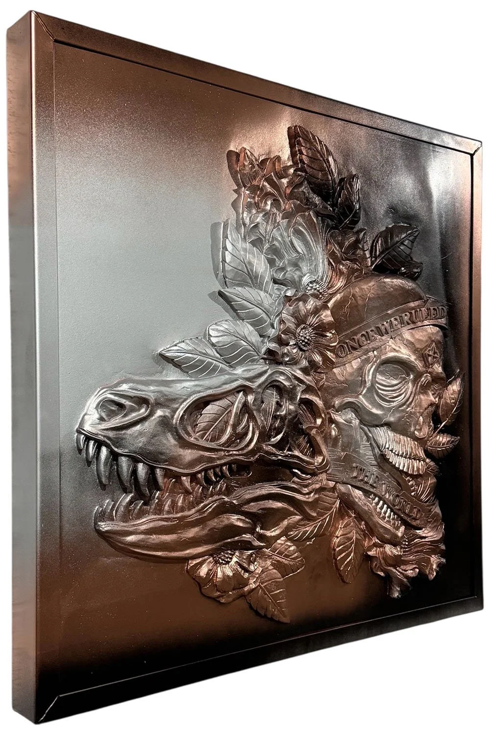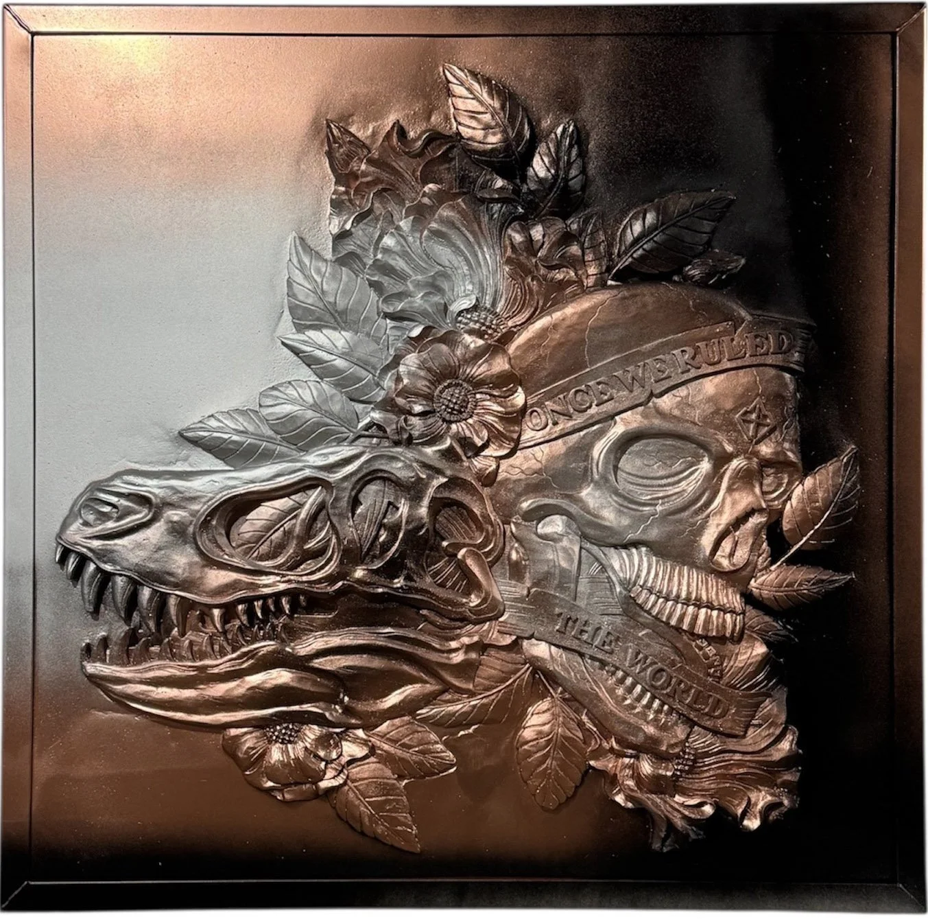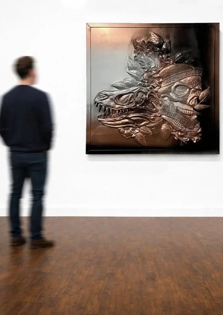 The phrase “Once We Ruled the World” reflects both pride and warning: every civilization and species eventually fades. The metallic palette of copper and steel appears turned inside out, as if emerging from within rather than covering the surface. This reflects the logic of X-ray vision, without enlightenment, where inner structures become visible and external appearances lose importance.